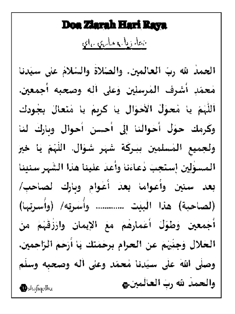 Doa ziarah hari raya Doa ziarah hari raya aidil fitri ya allah ya tuhan kami dengan keberkatan bulan syawal yang mulia ini turunkanlah rahmat dan keberkatan kepada kami semua ampunilah kami semua masukkanlah kami semua ke dalam syurga mu dan jauhkanlah kami daripada seksaan api neraka mu